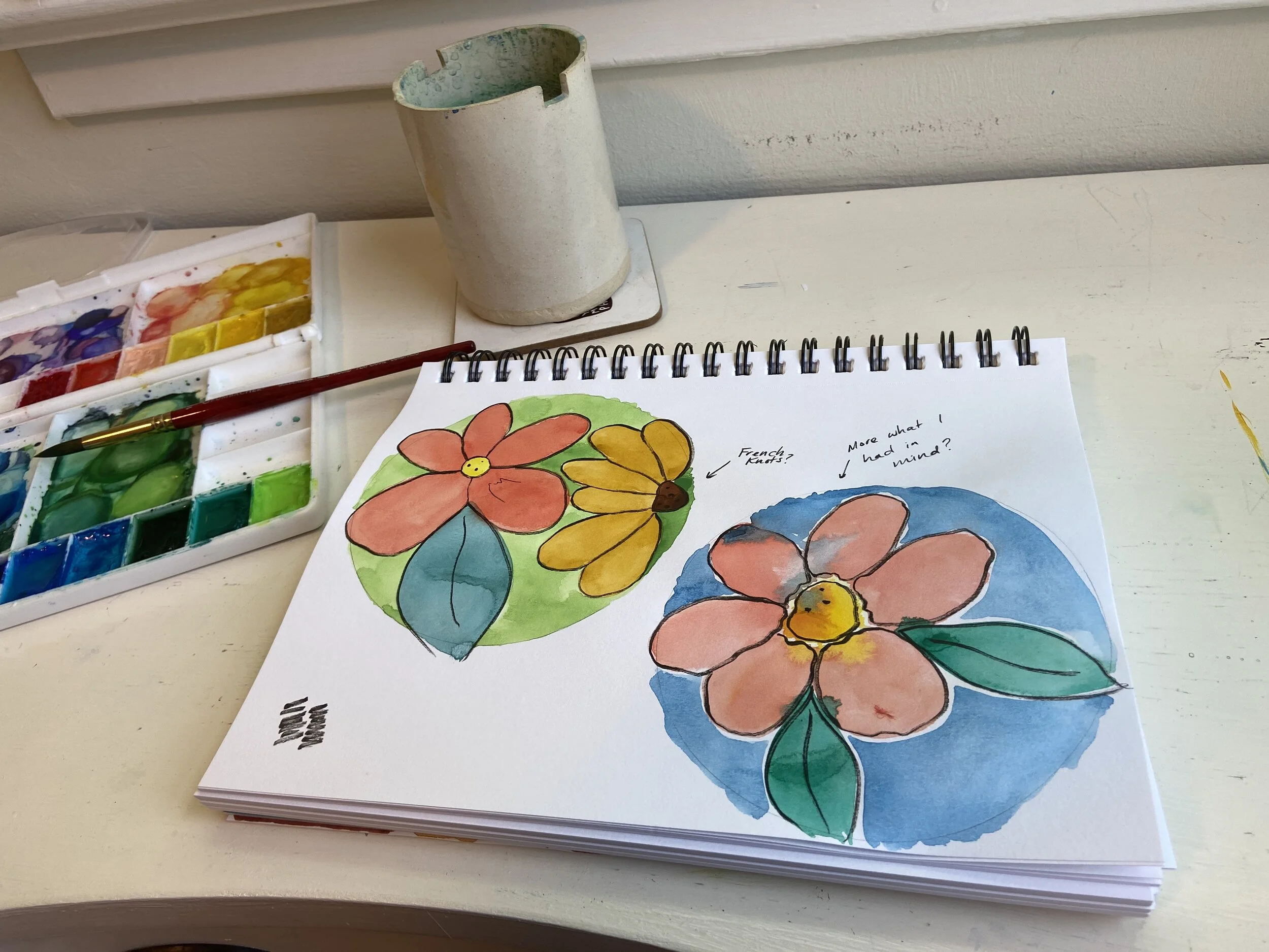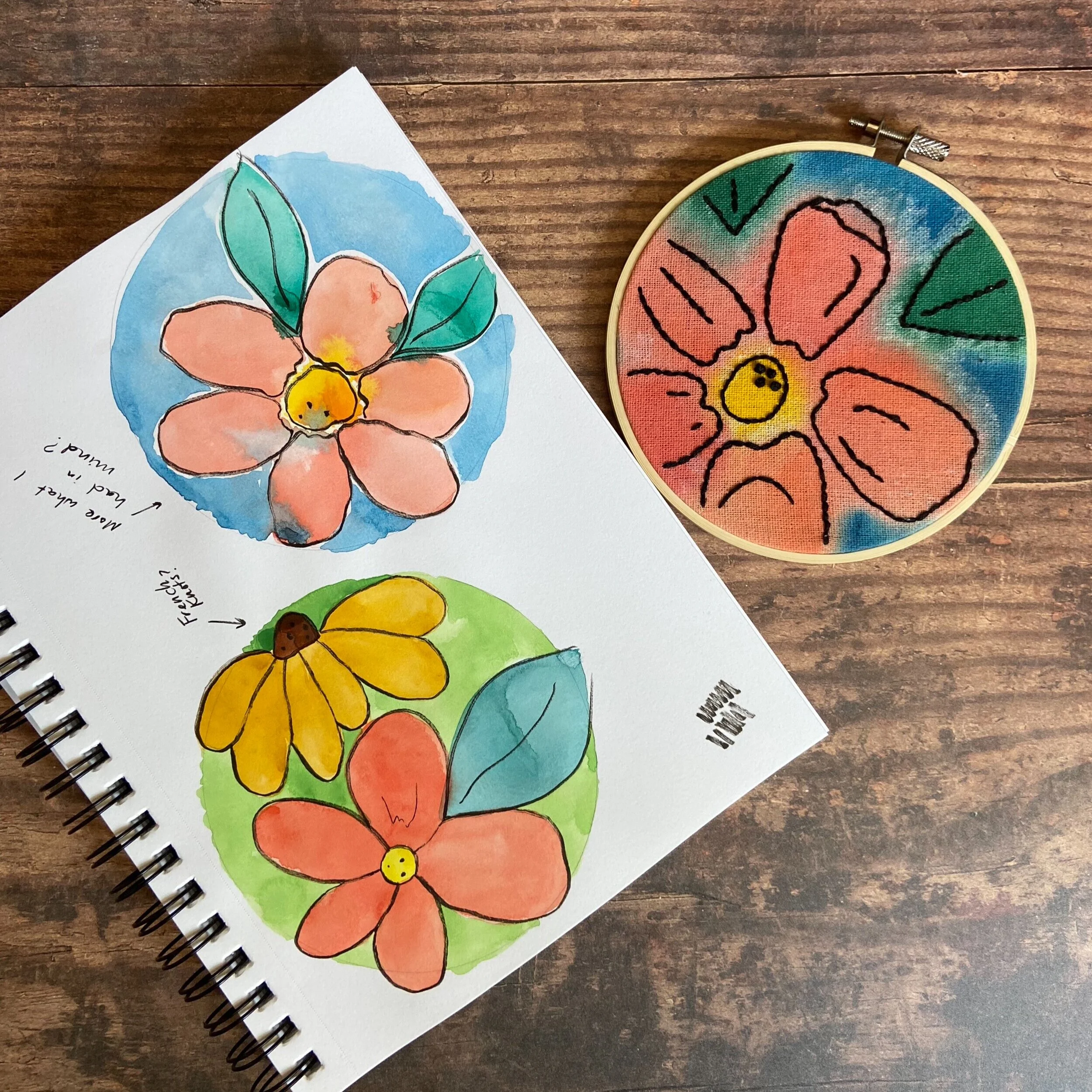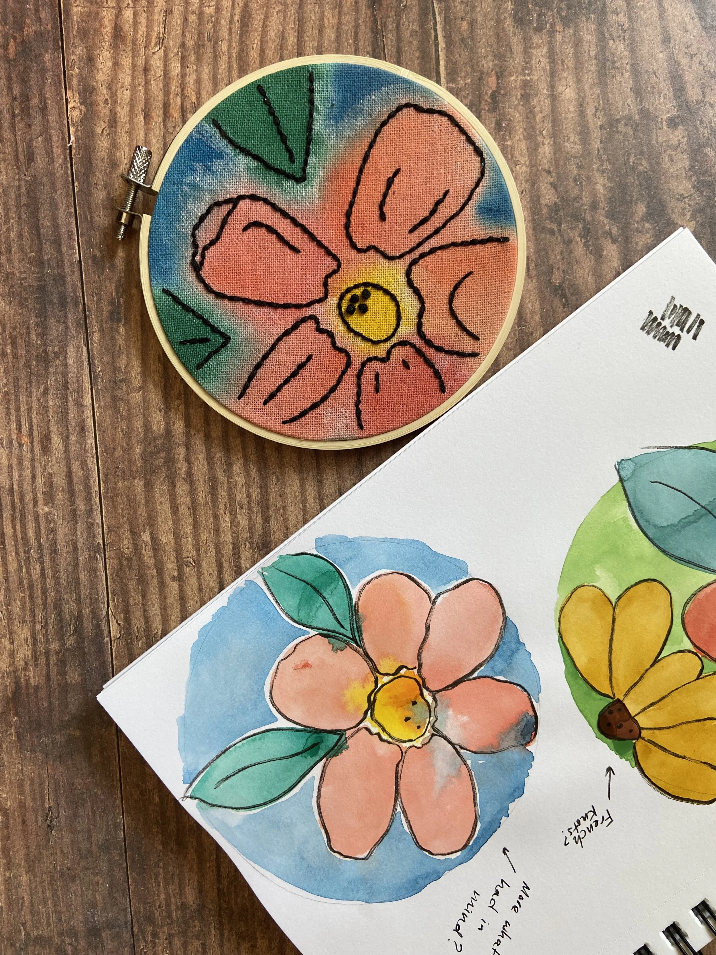 I started by making a sketch of what I thought I wanted the final piece to look like. I traced the inside of my hoop to make sure I kept the scale of my drawings accurate to fit on the final piece. The first sketch (with the green background) was fine, and I had an idea of how to add texture with french knots. However, I know that the watercolor will bloom and spread on the fabric, and I liked the colors on the second sketch, so I decided to try the single flower on the blue background.