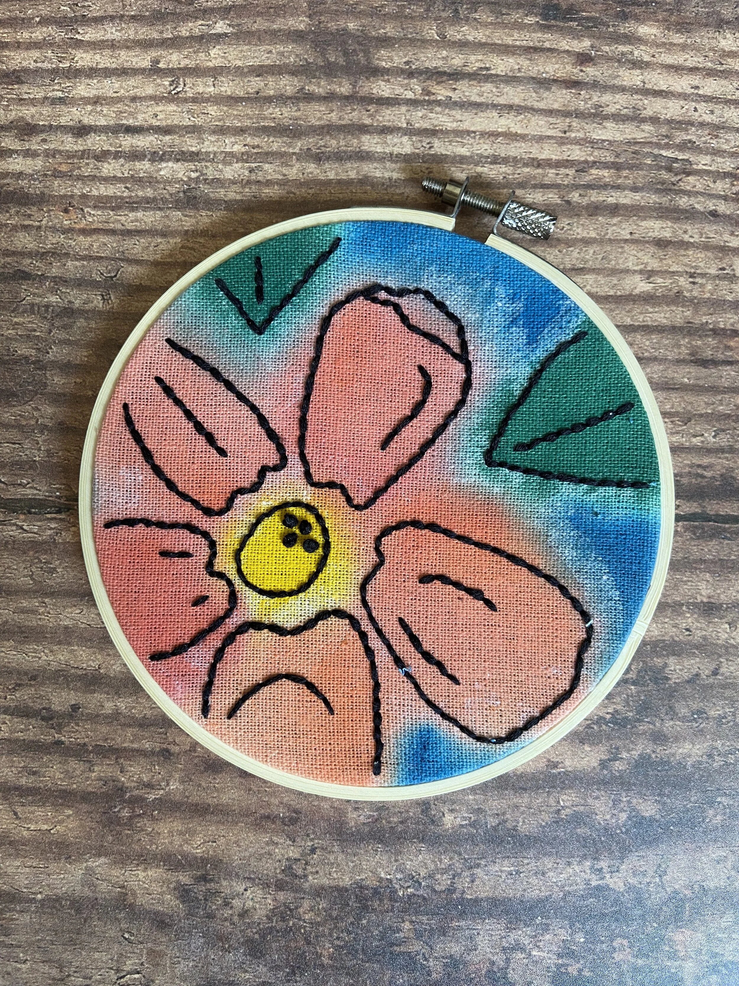 After my fabric dried I put it in my hoop. I then took black embroidery floss and stitched the outlines of the shapes of my drawing using a backstitch. I added a few french knots in the center of the flower to add some texture. I knew that I wanted this embroidery to match the feeling of my watercolor and ink drawings, so I wasn’t too precious about getting things perfect.