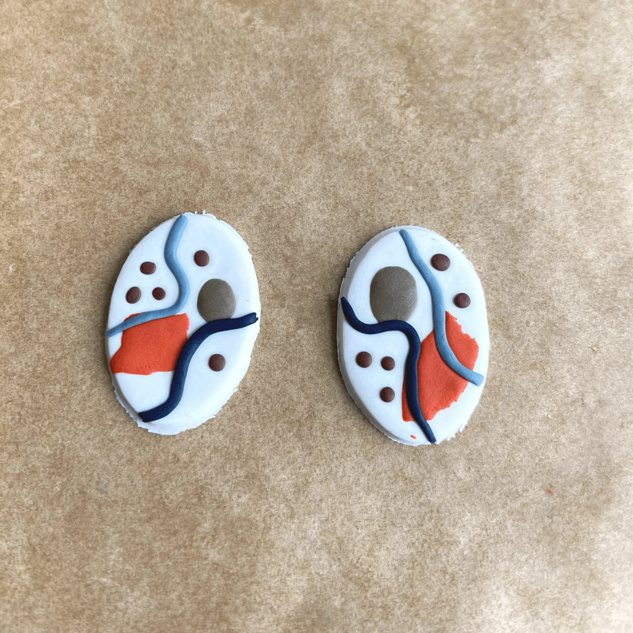 I then wanted to make some floral earrings. I cut my shapes out of a white slab and created flower petals and put them on the earrings. I made detail marks using a straight pin that I use for sewing. I tried to mirror my design on both sides. These ones turned out to be my favorites from this experiment.